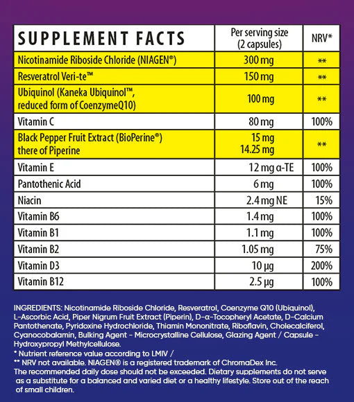 • ✓ Clinically proven NIAGEN®  boosts NAD+ by over 50% in 2 weeks